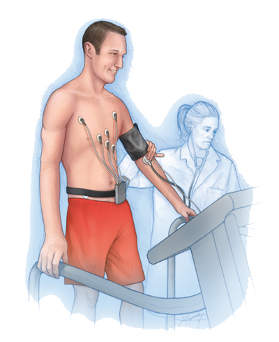Διαδικασία: Ο ασθενής, παρουσία καρδιολόγου, υπό συνεχή ηλεκτροκαρδιογραφική παρακολούθηση και συνεχή μέτρηση της αρτηριακής πίεσης, (ανάλογα με το εφαρμοζόμενο πρωτόκολλο κόπωσης) περπατά επί κυλιόμενου τάπητος, με σταδιακά αυξανόμενη κλίση και ταχύτητα, ώστε προοδευτικά να αυξάνεται η βαρύτητα της άσκησης. Κατά την διάρκεια της δοκιμασίας κόπωσης, αυξάνονται σημαντικά οι μεταβολικές ανάγκες των ασκούμενων μυών, με αποτέλεσμα να αυξάνεται η καρδιακή συχνότητα και η αρτηριακή πίεση, επακολούθως οι μυοκαρδιακές απαιτήσεις σε οξυγόνο. Η ικανοποίηση αυτών των αναγκών επιτυγχάνεται με αύξηση της στεφανιαίας ροής αίματος, γεγονός που δεν είναι εφικτό επί παρουσίας ανατομικών στενώσεων στις στεφανιαίες αρτηρίες. Επακόλουθα, η ισχαιμία του υποενδοκάρδιου στρώματος αποκαλύπτεται με τις παρατηρούμενες ηλεκτροκαρδιογραφικές αλλοιώσεις κατά την διάρκεια της κόπωσης, σε συνδυασμό με την καταγραφόμενη απάντηση της αρτηριακής πίεσης στο stress της άσκησης. Εναλλακτικά, ο ασθενής μπορεί να ασκηθεί με εργομετρικό ποδήλατο, ή μέσω εργομετρίας άνω άκρων , (σε ειδικές περιπτώσεις ασθενών, με ορθοπεδικά προβλήματα κάτω άκρων). |